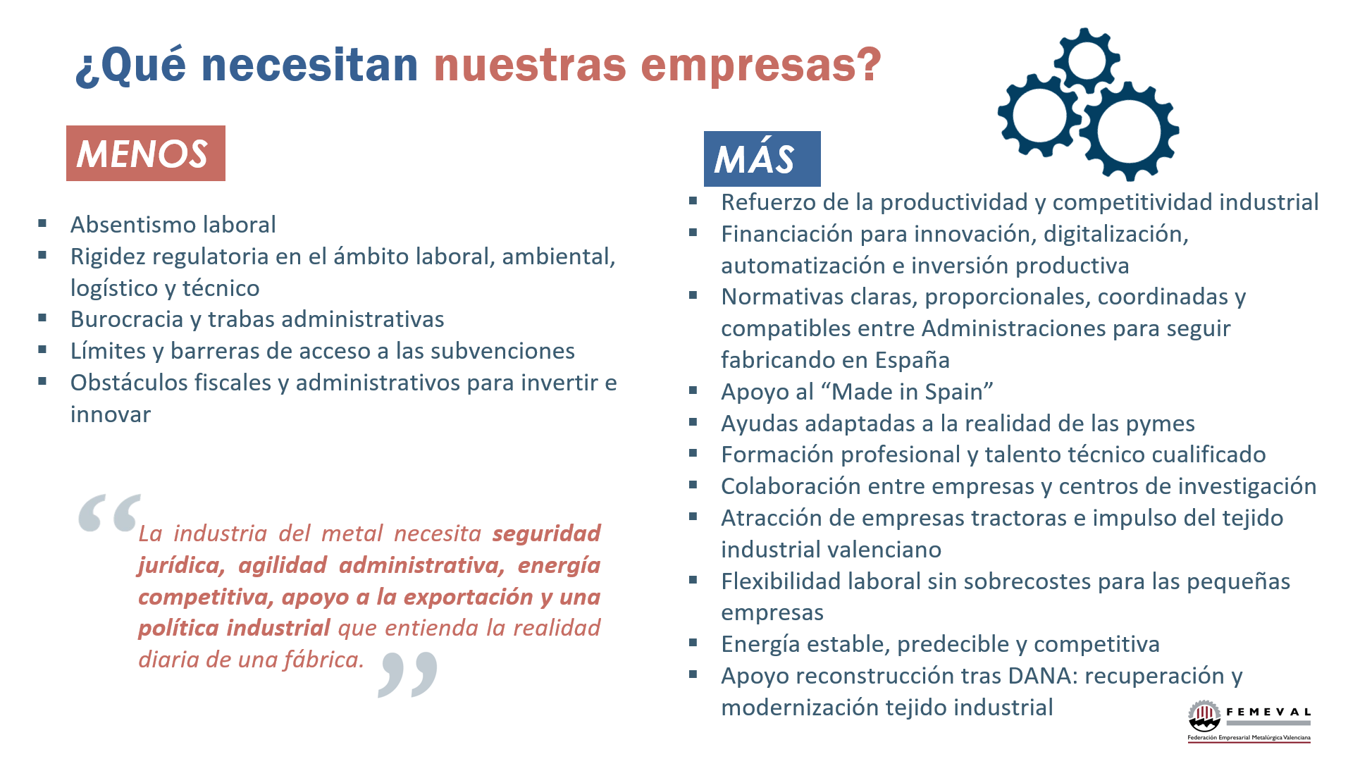 El metal valenciano pide al Gobierno de España más inversión, apoyo tras la DANA y menos trabas